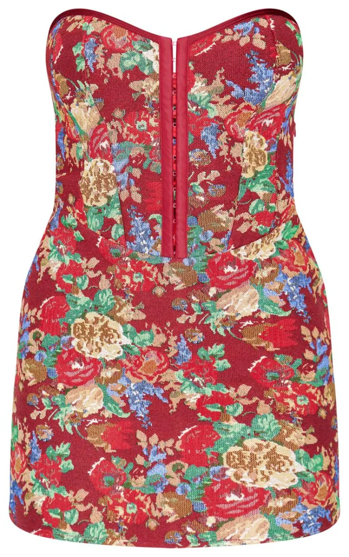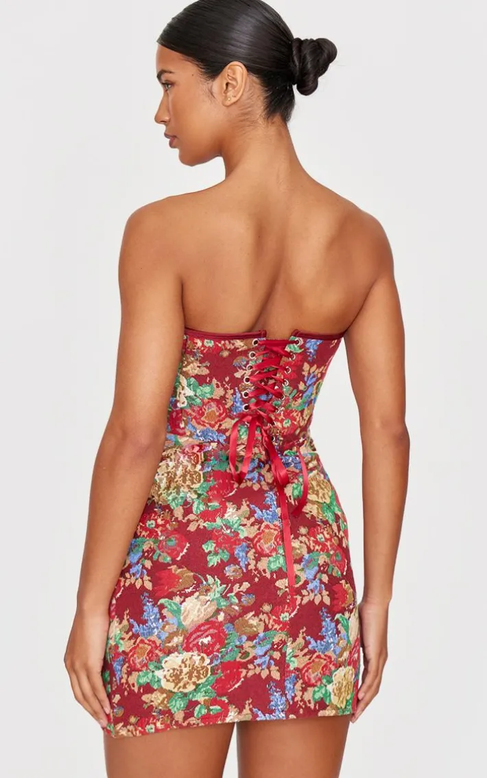 Stand out from the crowd for all the right reasons int his burgundy tapestry bandeau lace up back bodycon dress. Brought to you in a burgundy hue material with a tapestry print design, lace up back detailing and a bandeau neckline, how can you resist? Style this burgundy dress with heels and gold accessories for a look we just can’t get enough of.