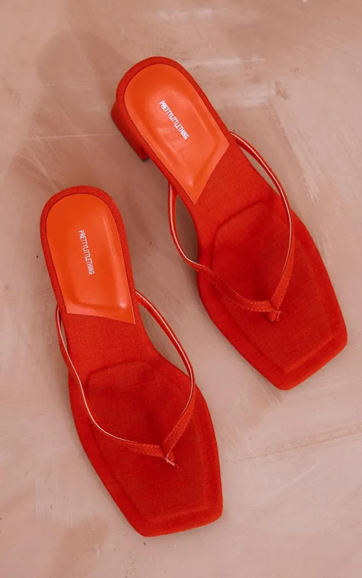 Get ready to bring all the bold hues to your outfit with these burnt orange linen look square toe thong block heeled mules. Made from a burnt orange linen look material with a square toe design, a thong style and block heels, what more could you need? Style these heeled mules seamlessly with any look for a statement finishing touch.