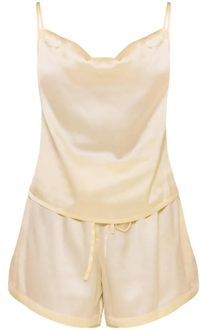 Take your sleepwear to a whole new level with this butter cream satin cowl neck cami and short pj set. This pj set includes a cowl neck cami top with matching shorts, both in a butter cream hue satin material which will have you looking and feeling all kinds of glam, how can you resist? Simply add slippers and simple gold accessories to complete the look we’re loving.