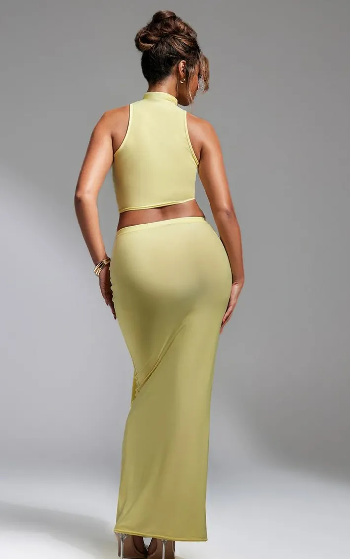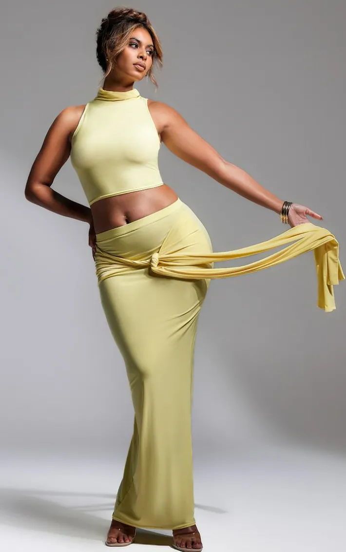 We’re totally in love with this butter cream slinky tie detail maxi skirt for your weekend plans. It is made from a butter cream slinky material with tie detail and a maxi length, how could you not be obsessed? This maxi skirt gives you endless styling potential and is bound to give your look that extra chic touch. Style seamlessly with the matching top, clear heels and gold accessories for a seriously luxe finish.