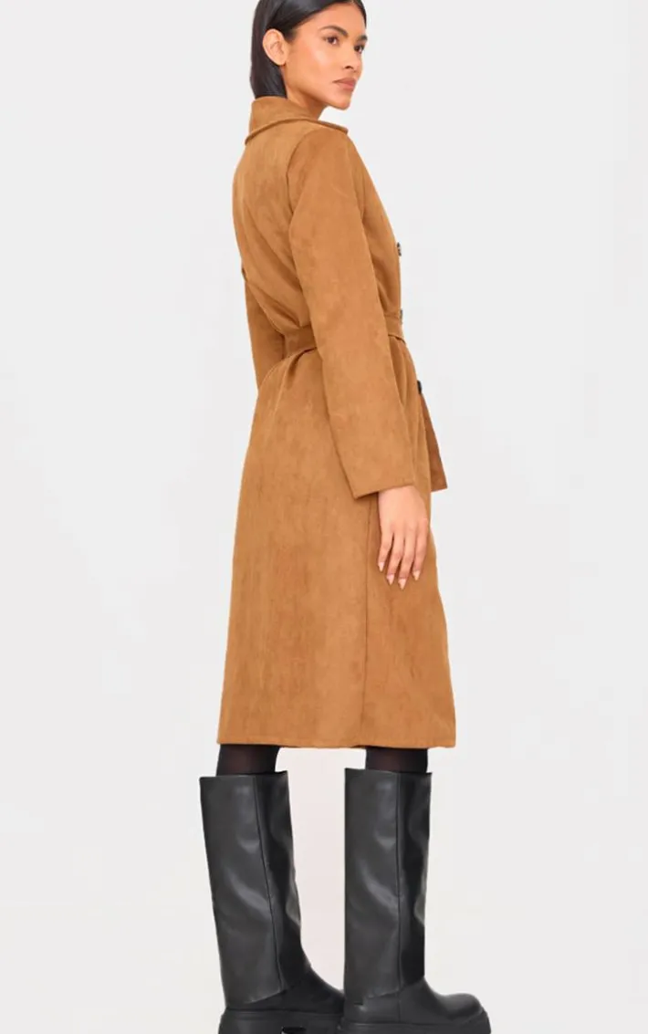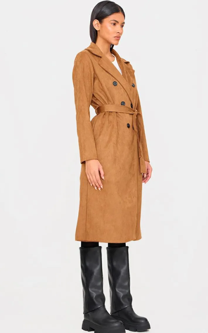 Elevate your outfit of the day with this camel faux suede trench coat. Brought to you in a camel hue faux suede material with a belted design and a trench style, we are so obsessed. Layer this trench coat over your fave wardrobe pieces for a look that won’t go unnoticed this season.