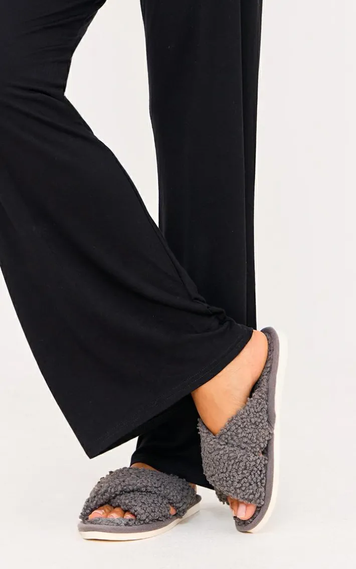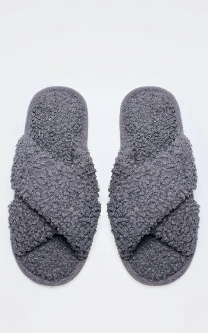 These charcoal borg cross over slippers are a perfect addition to your cosy collection. Brought to you in a staple charcoal shade, with a luxe borg material and cross over design, they are a versatile option for a night in. Simple style with a lounge set to finish the look.