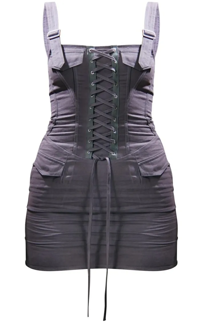 Make a statement this season with this charcoal cargo lace up detail buckle strap bodycon dress. This dress is made from a charcoal hue in a cargo material for a grunge look we are loving. With a lace up detail and a buckle strap, what’s not to love? Team with a pair of black boots, sunglasses and a clutch bag to complete the look that can be taken from day to night.