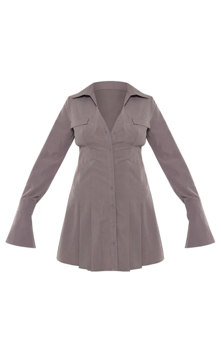 Take the stress out of weekend styling with this charcoal cotton poplin pleated flared sleeve shirt dress. Brought to you in a charcoal hue cotton poplin material with a pleated design, a button through fastening and long flared sleeves, what more could you want? Style this shirt dress with knee length heeled boots and a mini bag for a seriously chic look that won’t go unnoticed.