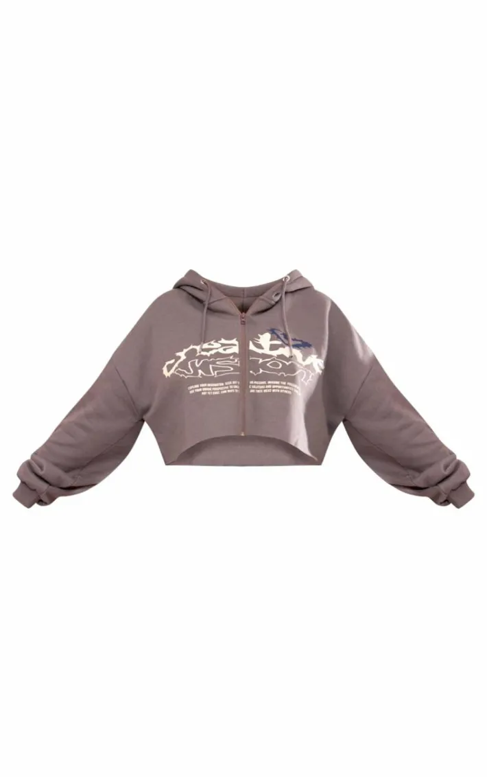 Your off-duty days are calling out for this charcoal Graphic oversized cropped zip hoodie. Brought to you in a charcoal material with a Graphic design and an oversized fit, what more could you want? This cropped hoodie has a zip fastening that is sure to feel edgy. Team with your fave accessories and the matching sweatpants to finish off the look we are loving.