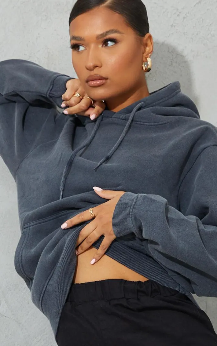 Hit refresh on your off-duty wardrobe with this charcoal hue overdyed washed hoodie. Brought to you in a charcoal hue washed material with an oversized fit, what more could you ask for? This seriously comfy hoodie is sure to be your new go-to for those chilled days and beyond. Team with sweatpants, a vest and chunky sneakers for a fierce off-duty ‘fit we just can’t get enough of.