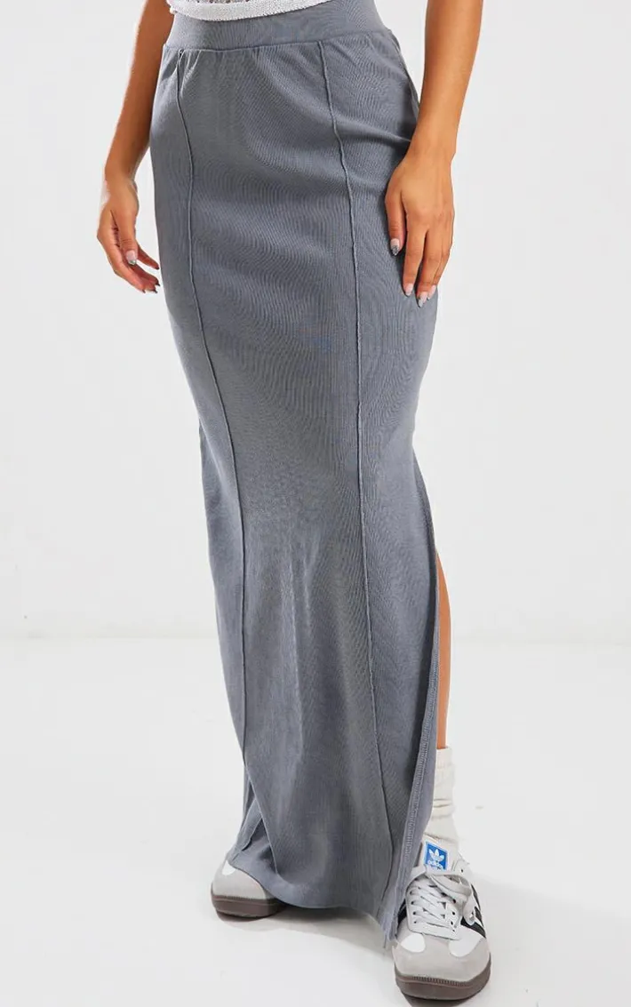 Give your new season wardrobe a chic upgrade with this charcoal ribbed pocket back detail maxi skirt, it is perfect for dressing up or down. Made using a charcoal ribbed material with a back pocket detail and a maxi length, this skirt just went straight to the top of your hit list. Style it with a basic top, a faux leather jacket and your fave sneakers for a look everyone will love.
