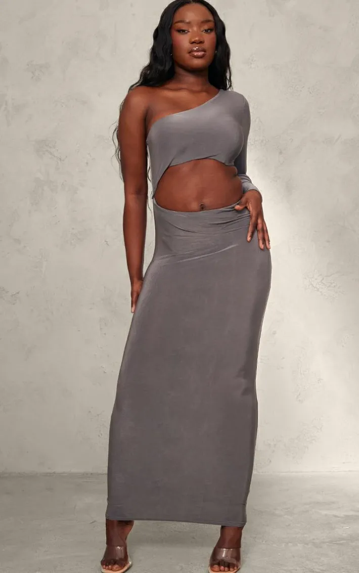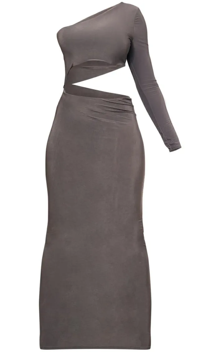 When the weekend calls for a little drama this charcoal slinky will have you at the center of attention. It is made using a charcoal slinky material with a one shoulder design and a cut-out waist, what more could you want ? Style this midaxi dress with clear slip-on heels and statement accessories to elevate the look further.