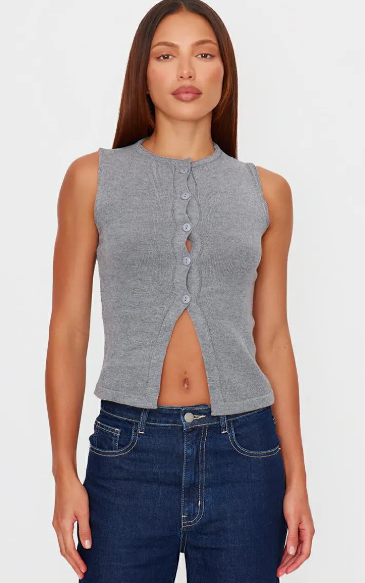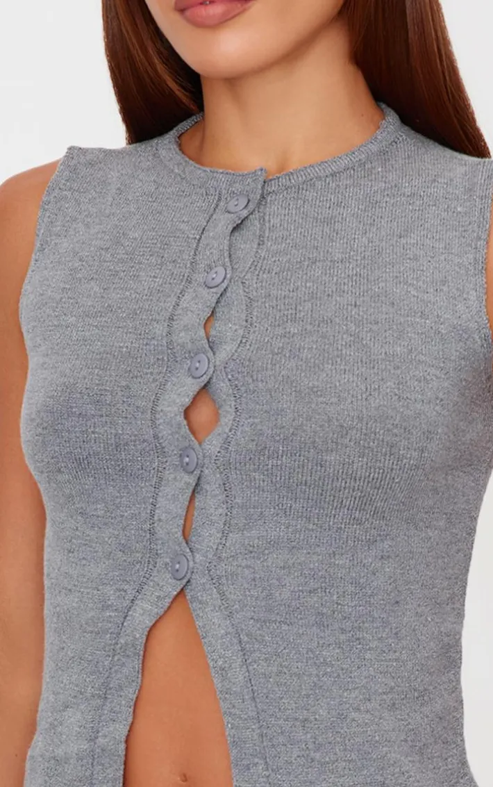 Cosy season layering has never been so easy as with this charcoal soft knitted button through vest. Brought to you in a button down vest design with a charcoal hue and soft knitted fabric, your everyday look is sorted. Style this knitted vest with jeans and comfy kicks for a laid back finish.