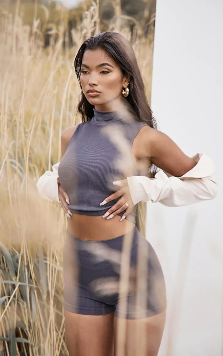 Give your everyday look an edge with these hot pants. Featuring a charcoal ribbed fabric with a structured contour design, wear with the matching crop top and heels for the ultimate weekend worthy combo.