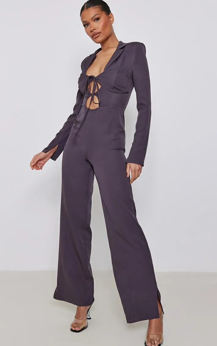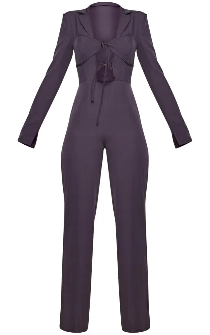 Give your weekend wardrobe the ultimate glow up with this charcoal woven bust tie detail split hem blazer style jumpsuit. You’re sure to have all eyes on you. It features a charcoal hue woven material with a tie bust detail, a split hem design and a blazer style, we’re in love. Pair with your fave slip-on heels and minimal accessories for a flawless look that will get you noticed.