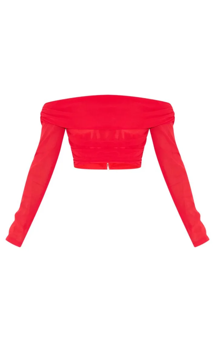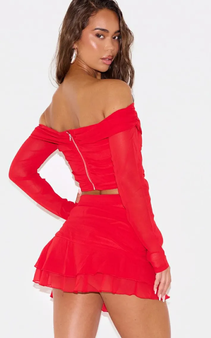 Your wardrobe is calling out for this cherry red chiffon off the shoulder long sleeve crop top for your new season look doll. With a cherry red chiffon material with an off the shoulder design, how could you resist? Its long sleeve fit and cropped length, you will be totally on trend doll. Team with a mini skirt, clear heels and gold accessories for a weekend-worthy finish.