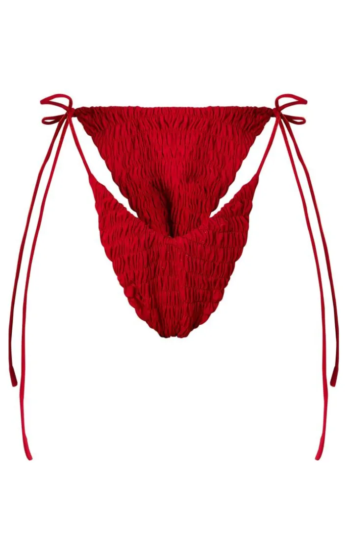 We are loving these cherry red crinkle tie side bikini bottoms for your vacay wardrobe. Brought to you in an on-trend cherry red hue crinkle material with tie side fastenings and a flattering fit, how can you resist? Pair these bikini bottoms with the matching bikini top and statement gold accessories for a fierce poolside look that will steal all the stares.