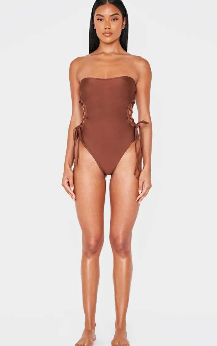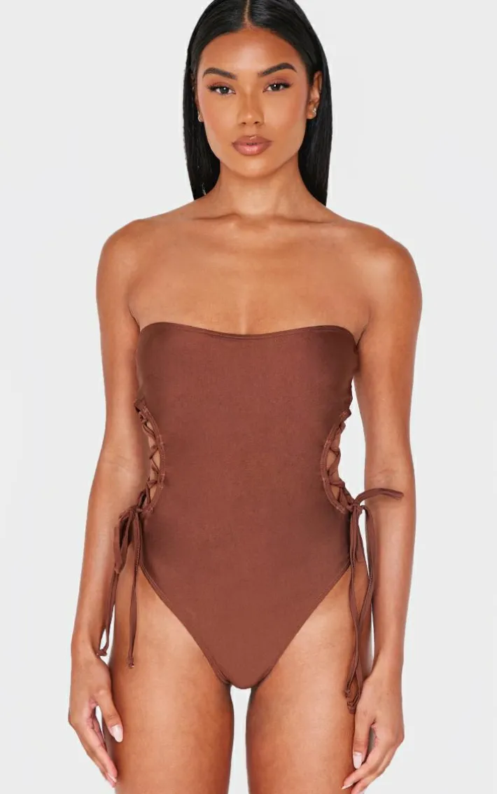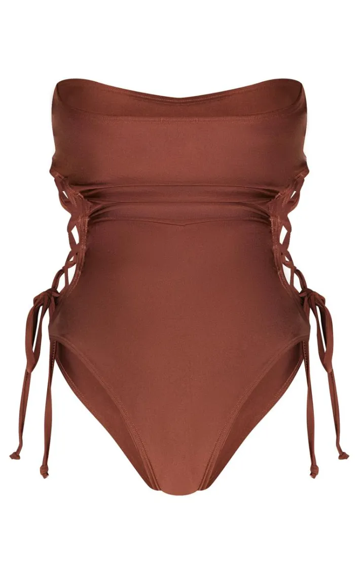 Make styling easy with this chocolate bandeau lace up side swimsuit. Brought to you in a chocolate hue swim material with a bandeau neckline and lace up side detail, this swimsuit is all the new you need. Style with shades, simple accessories and a chic cover up for a look that’s sure to get you noticed.