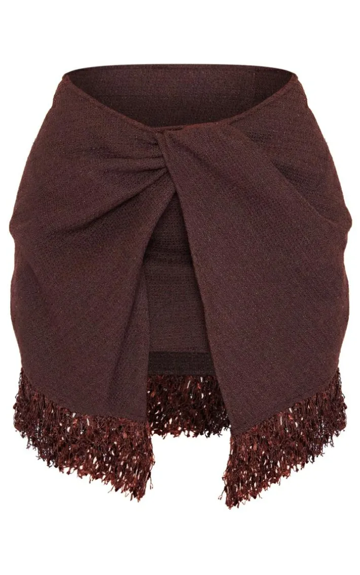 Give your weekend wardrobe the update it deserves with this chocolate boucle tassel hem drape front mini skirt. Brought to you in a chocolate hue boucle material with a drape front design and tassel hem detailing, how can you say no? Style this mini skirt with a crop top and knee length boots for a look that is sure to make heads turn wherever you go.