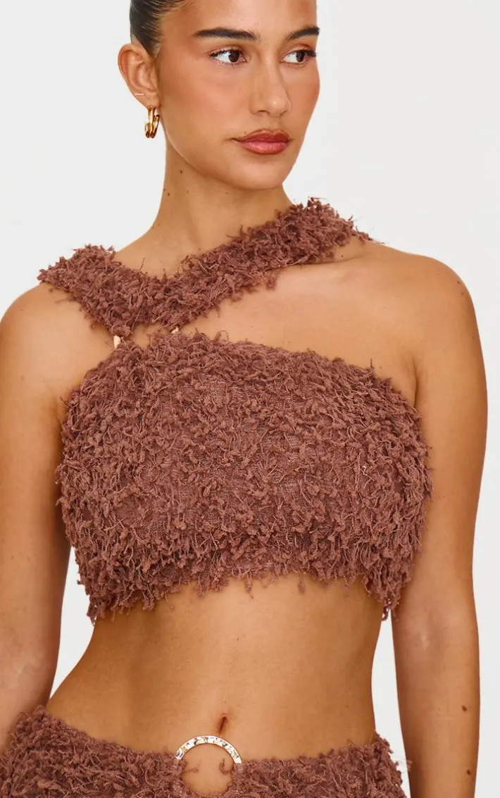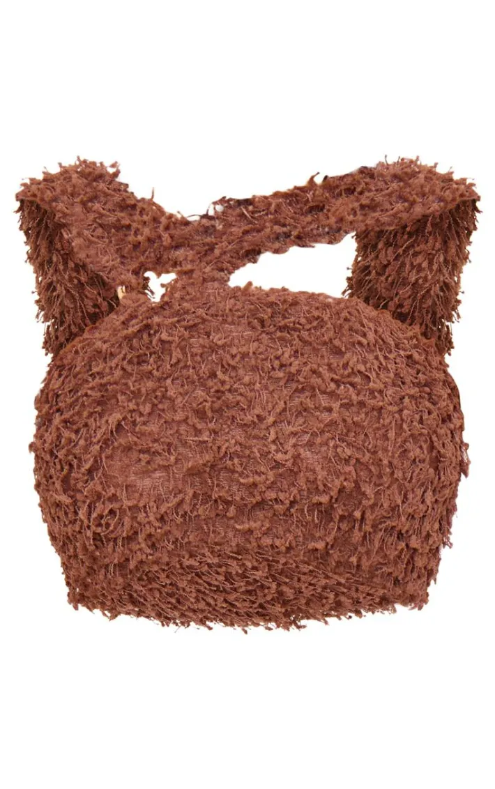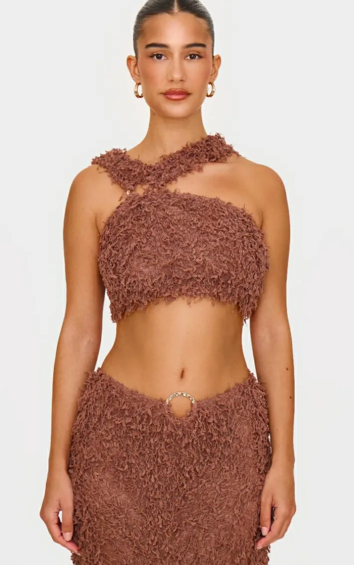 Elevate your weekend look with this chocolate brown fluffy textured halterneck trim detail crop top. Made from a chocolate brown fluffy textured material with a halterneck design, trim detailing and a cropped fit, we are obsessed. Pair this crop top with the matching skirt and heels for a look that is sure to turn heads.