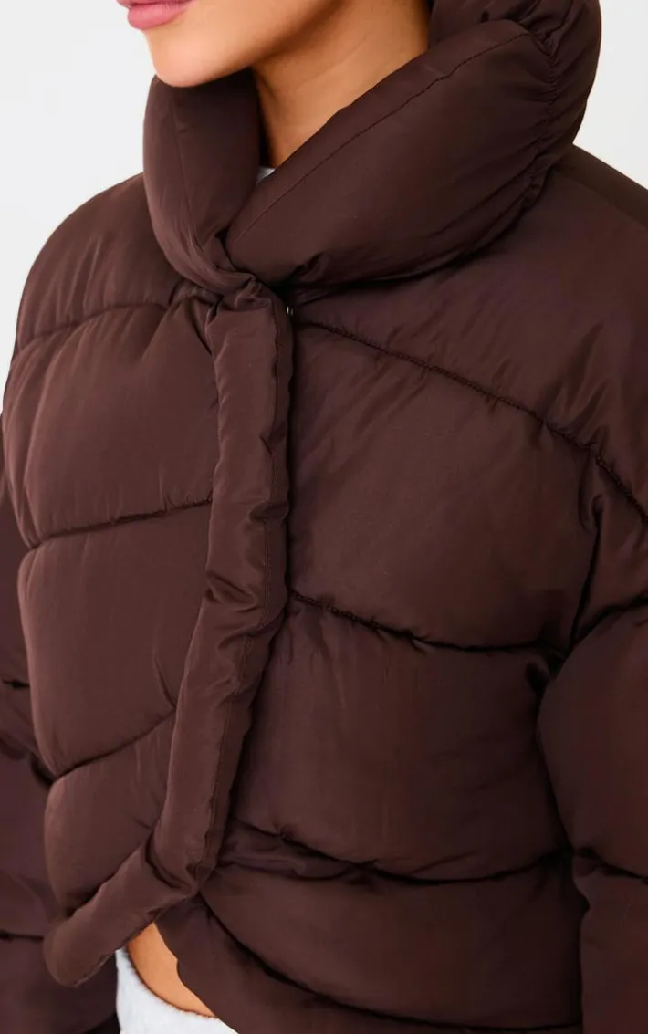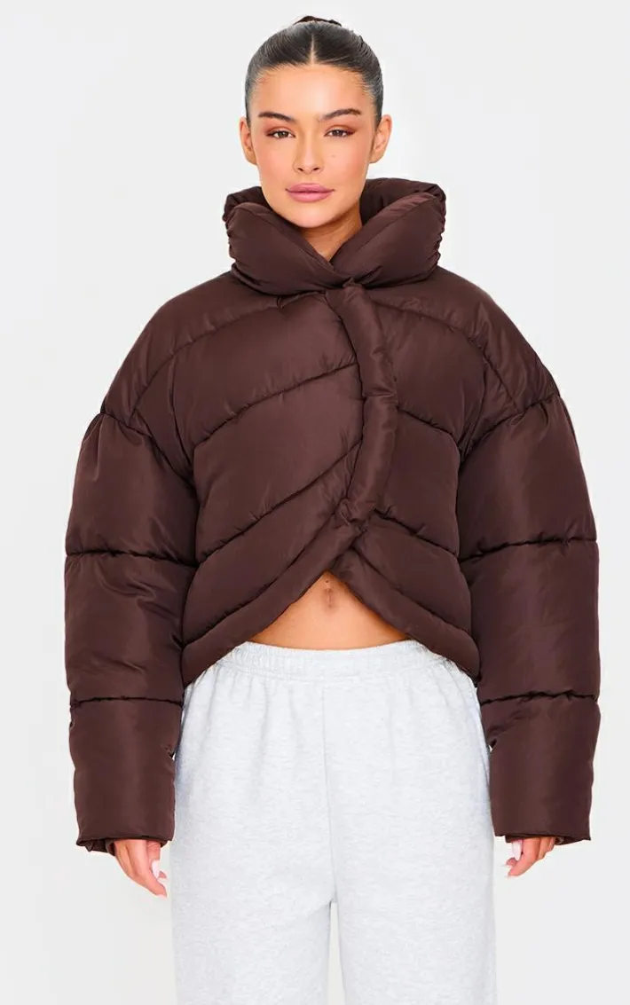 When the cold weather calls, so does this chocolate brown quilted asymmetric high neck puffer jacket. Brought to you in a chocolate brown hue quilted material with an asymmetric design and high neck detail, this puffer jacket is all the new you need. Style seamlessly with wide leg bottoms, fresh kicks and simple accessories for a chic finish.