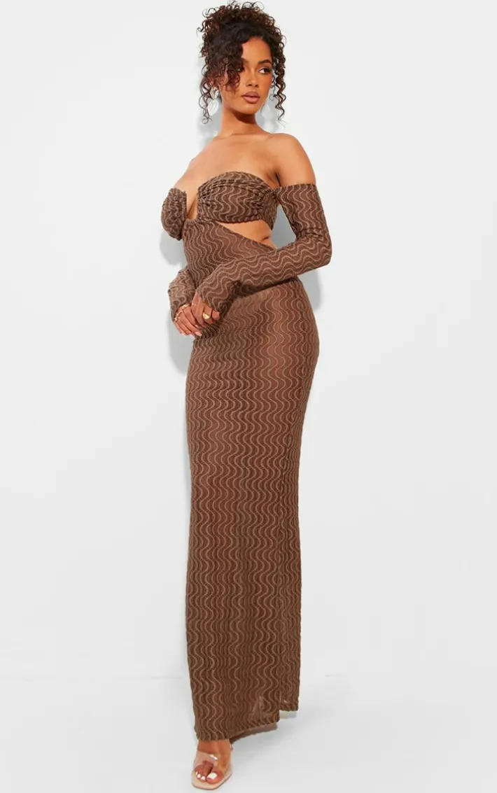 Give your new season wardrobe the luxe upgrade it deserves with this chocolate brown ribbed bardot long sleeve cut out maxi dress. With a chocolate brown ribbed material, a bardot style and long sleeves, you’ll be reaching for this maxi dress whatever your plans. Style this ribbed dress with your fave accessories for an instant chic finish.