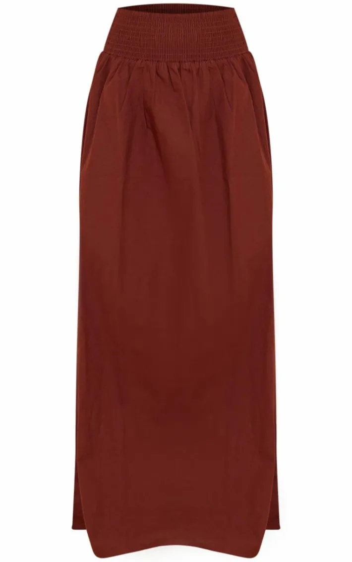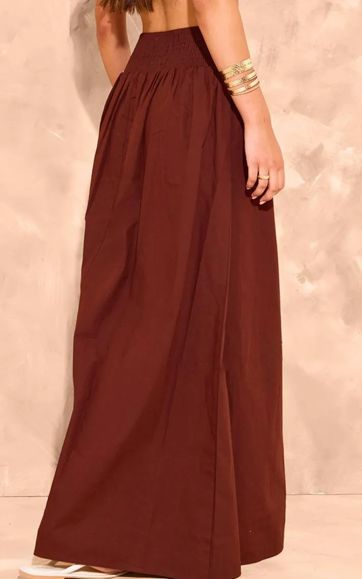 Give your new season wardrobe the effortlessly chic upgrade it deserves with this chocolate cotton poplin shirred waistband flowy maxi skirt, you’re sure to have heads turning. This skirt features a chocolate cotton material with a shirred waistband and a flowy style. Pair this maxi skirt with a basic crop top, sandals and statement accessories for a flawless finish.