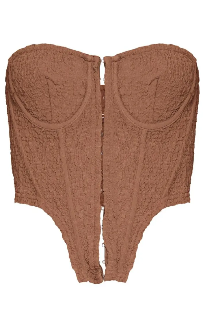 This season a chocolate crinkle textured hook and eye boned strapless corset is essential and we are loving this style. Brought to you in a chocolate crinkle textured material with a hook and eye fastening, we are seriously obsessed. With boned detailing and a strapless fit, this corset is the ultimate must-have in your collection. Team with the matching skirt and some knee high boots for a fool proof finish.