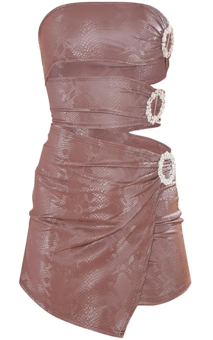 Found some last-minute weekend plans and need an unreal ‘fit? Then we have you covered with this styling staple, a chocolate croc print PU diamante detail cut out bandeau bodycon dress. With a chocolate croc print PU material with diamante detailing, a cut-out design and a figure-hugging fit, we’re obsessed. Work your styling techniques and add a your dreamy high heels and statement accessories for a weekend-worthy finish that will gain all the likes.