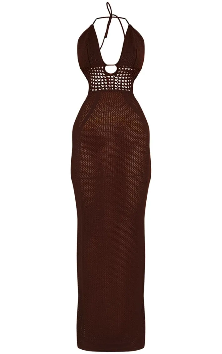 Steal all the stares this season in this chocolate crochet knit tie waist halterneck maxi dress. Brought to you in a chocolate hue crochet knit material with a tie waist detail and a halterneck design, this maxi dress is calling your name. Style seamlessly with high heels and gold accessories for a beachy finish that will turn heads for all the right reasons.