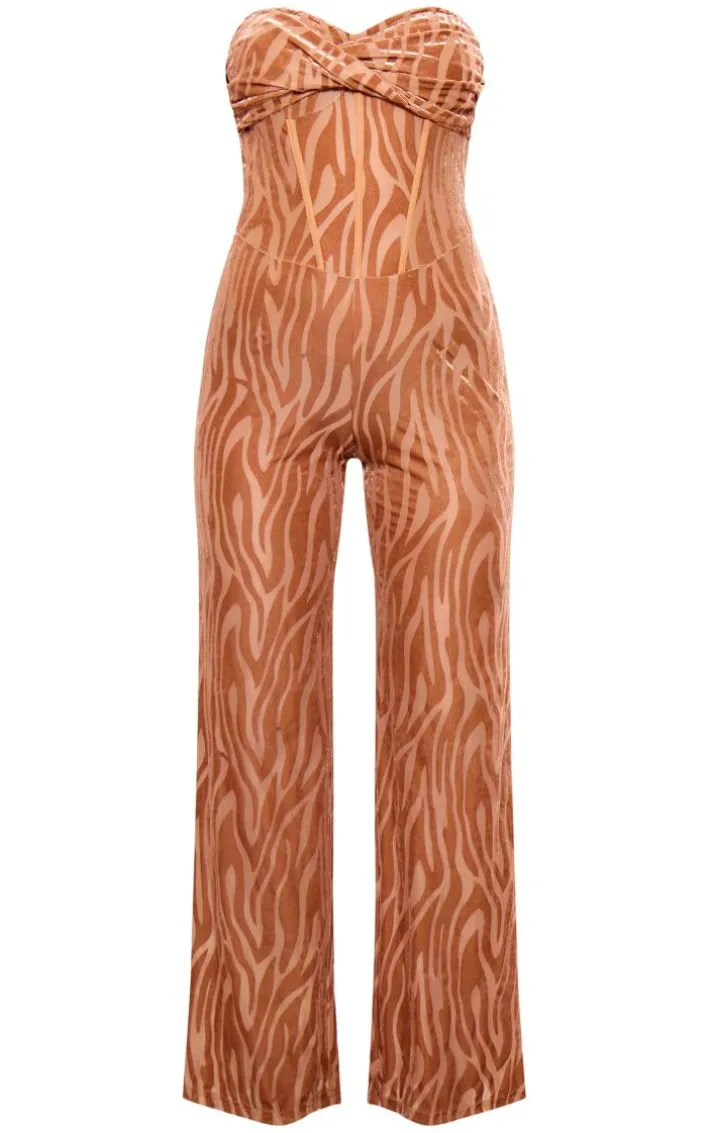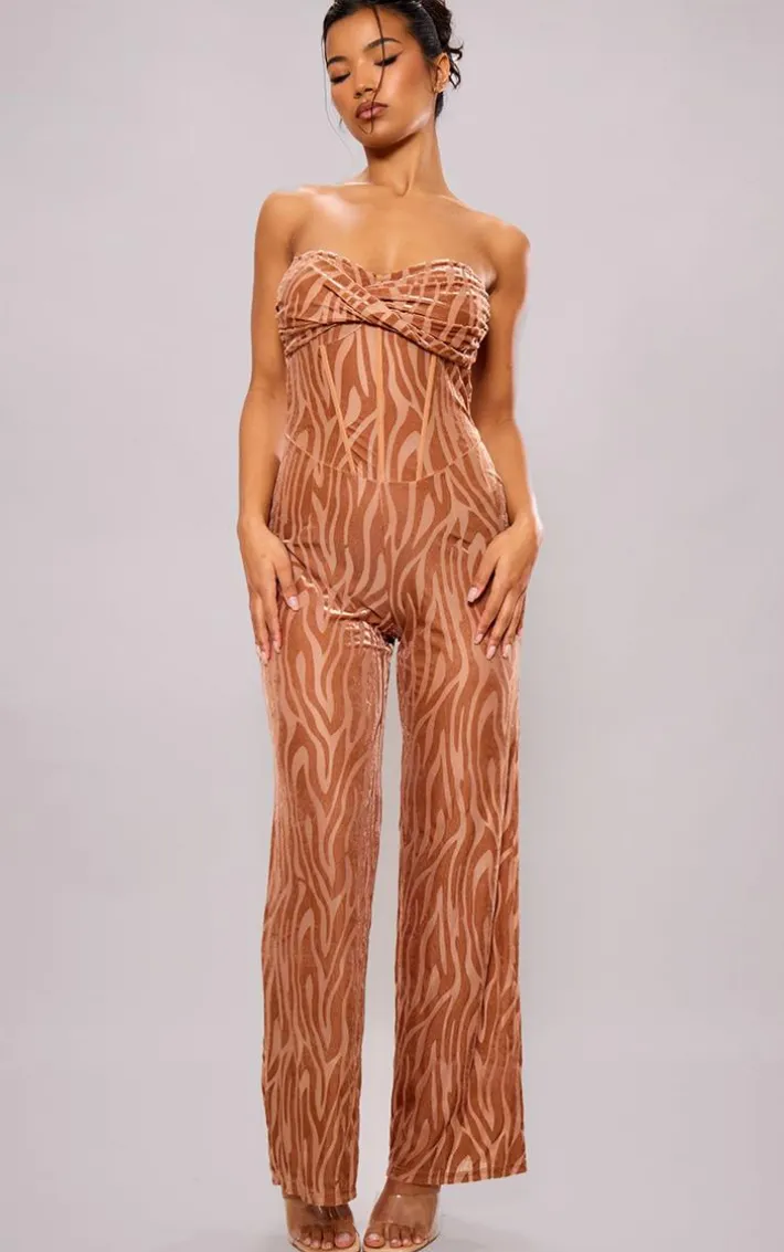 Switch up your weekend style game with this unreal chocolate devour bandeau corset wide leg jumpsuit. Brought to you in a chocolate hue devore material with a bandeau neckline, a flattering corset design and a wide leg fit, how can you not be obsessed? Style this wide leg jumpsuit with your highest heels, a mini bag and gold accessories for a look that is sure to make heads turn wherever you go.