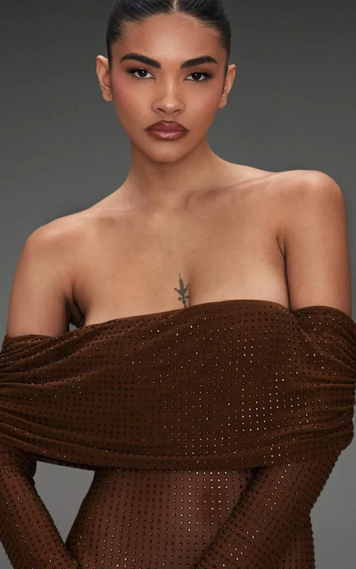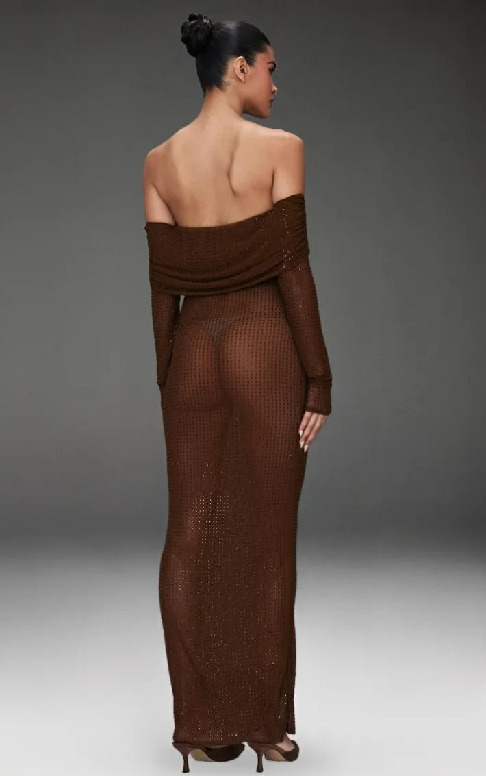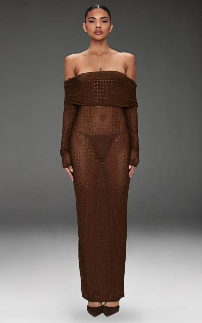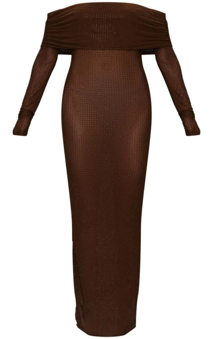 Have all heads turning in your direction on your next night out with this chocolate diamante mesh bardot maxi dress. With its elegant maxi dress length, chocolate diamante mesh fabric and bardot neckline, you’ll be feeling so confident in this. Style with chic heels and your favorite jewelry for an unmissable finish.