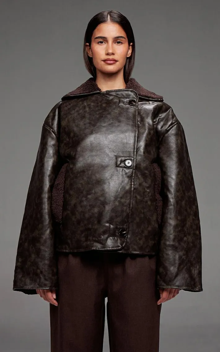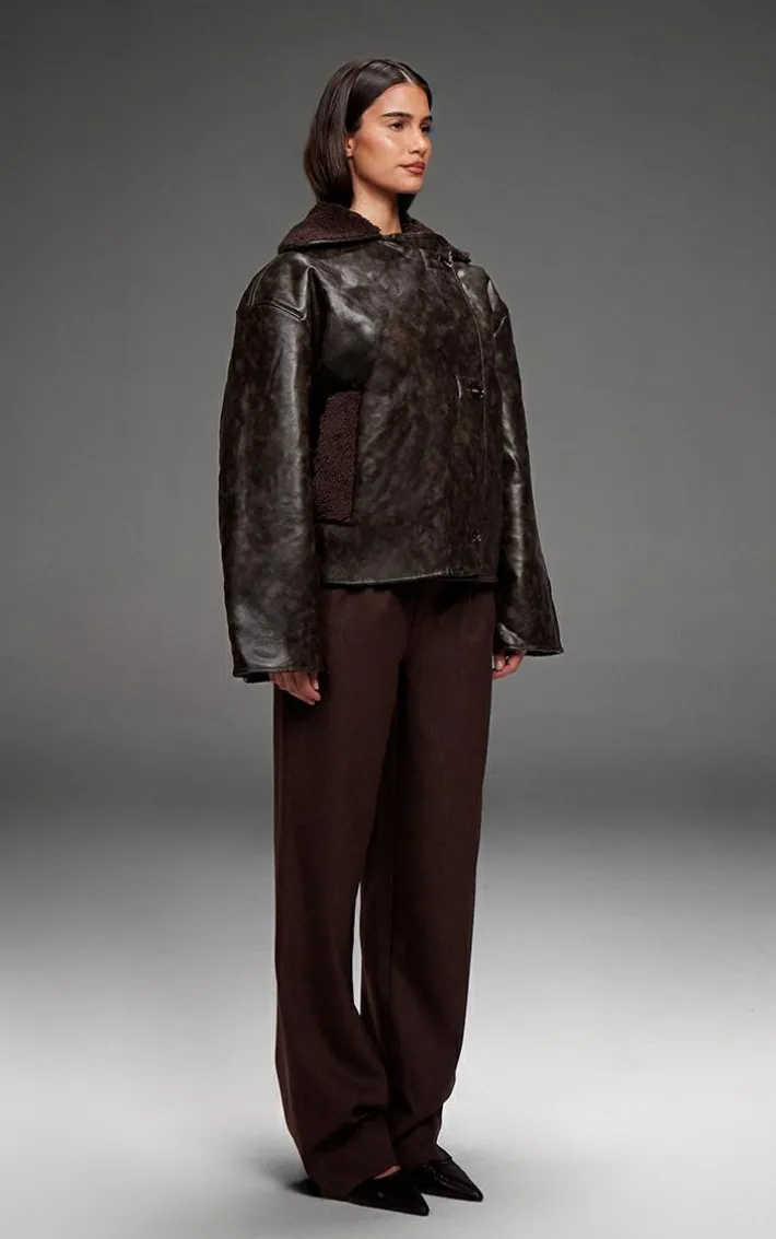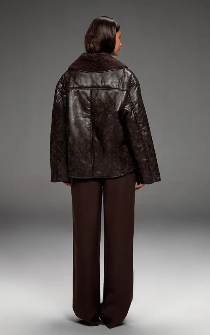 Meet your new season style saviour, this chocolate distressed faux leather borg contrast aviator jacket. Made from a chocolate distressed faux leather material with a contrasting borg design and button fastenings, how can you resist? Style this aviator jacket with your outfit of the day to add an edge to any look.