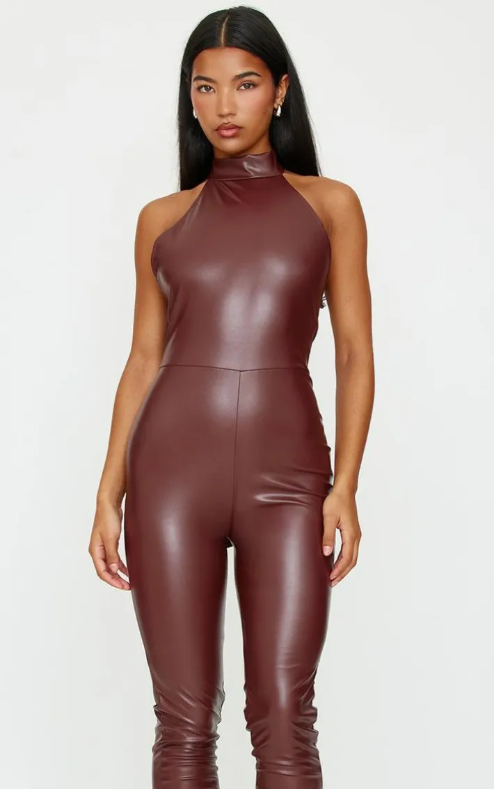 Make a statement with this chocolate faux leather halterneck back tie straight leg jumpsuit. Brought to you in a chocolate hue, with a luxe faux leather material, halterneck design and a back tie detail, how can you resist? Style with a pair of brown heels and silver accessories for a chic finish.