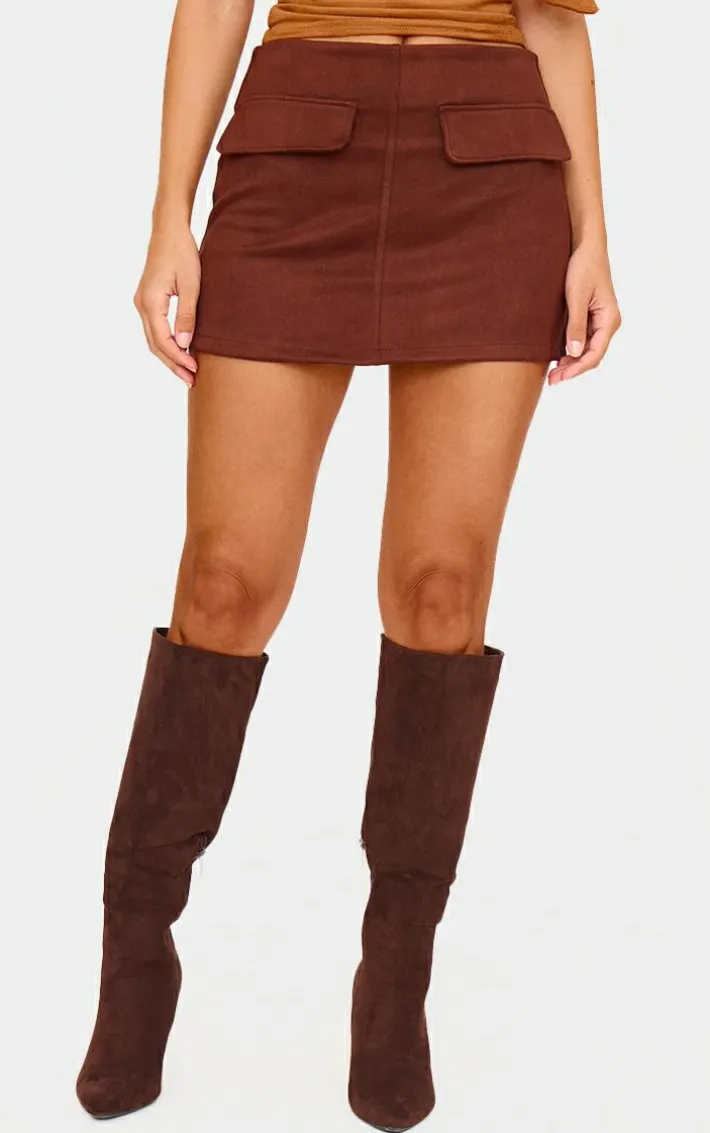 We can’t get enough of this chocolate faux suede pocket front mini skirt for a weekend-worthy look. Brought to you in a rich chocolate hue, with an edgy faux suede material and pocket front design, this skirt is all the new you need. Team with a pair of faux leather knee length boots and a shoulder bag for a fool proof finish.