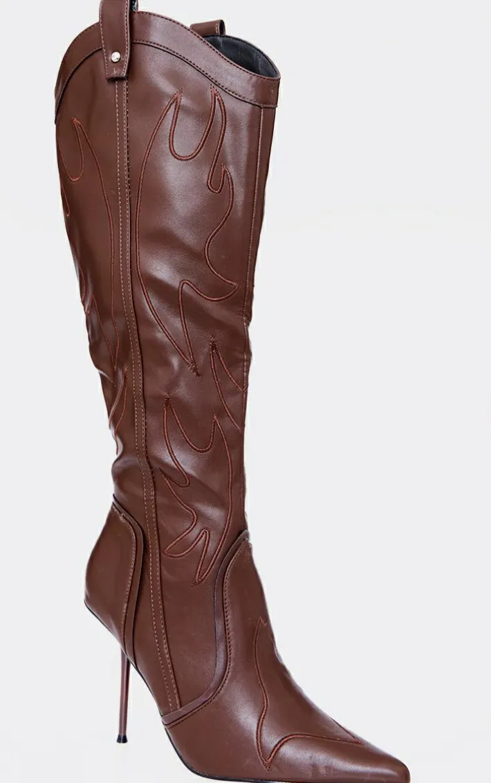 Take your look from 0-100 with these chocolate PU point toe distressed western stiletto heeled knee high boots. Brought to you in a chocolate PU material with a point toe design and a distressed detailing, what’s not to love ? These western stiletto heeled boots are sure to make you center of attention wherever you step foot. Team these knee high boots with some oversized shorts and a crop top to finish off the look.