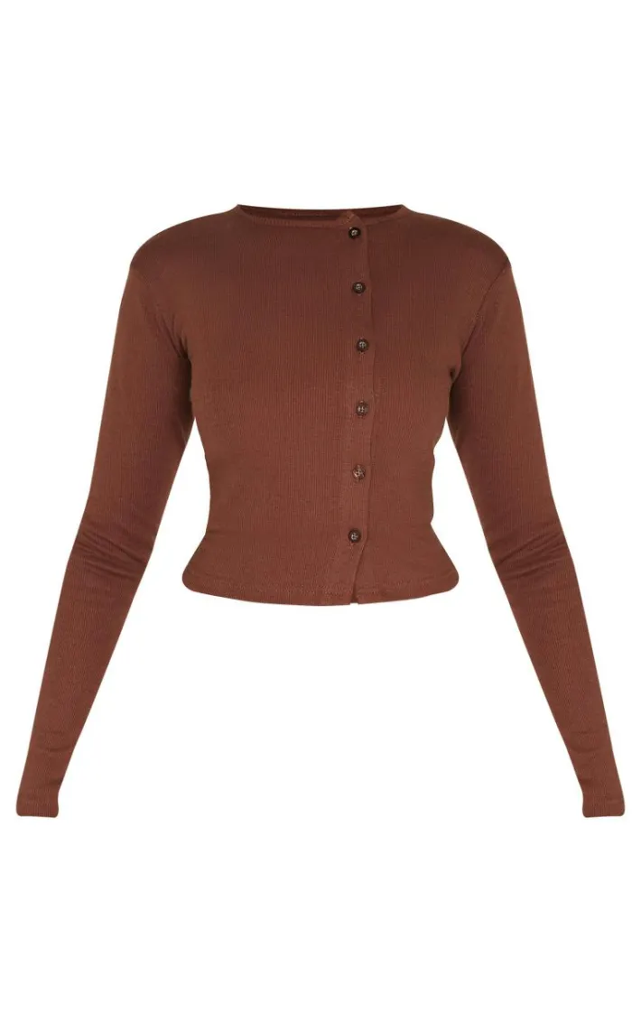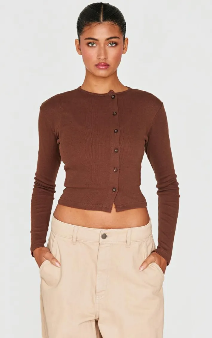 Add this chocolate ribbed asymmetric button down fitted long sleeve top to your bag for a style we’re loving. Brought to you in a seasonal chocolate hue, with a ribbed material, asymmetric button alignment and fitted finish, you’ll be earning all the compliments. Team with some wide leg cargos and sneakers for an effortlessly off-duty look.