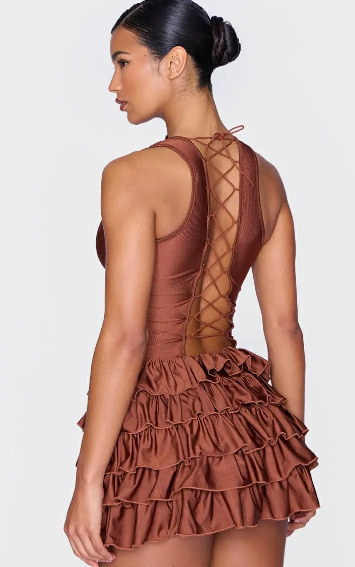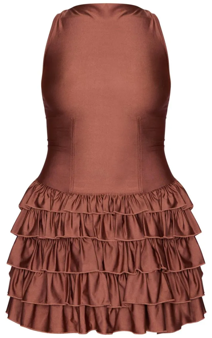 Be the best dressed with this chocolate slinky frill hem micro mini dress. Brought to you in a chocolate slinky material with a frill hem detail and a micro mini length, you are sure to turn heads for all the right reasons in this mini dress. Team with a pair of court heels and your go-to accessories to finish off the look we are loving.