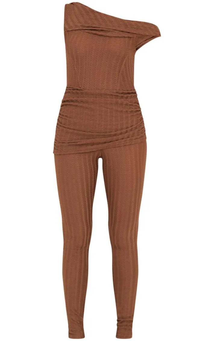 We are obsessed with this chocolate textured asymmetric corset detail jumpsuit. With so many features including its textured chocolate fabric, asymmetric shoulder design and ruched waist, you’re going to look unreal. Add a pair of statement gold earrings, slip on heels and style with a slicked back bun for the ultimate look.