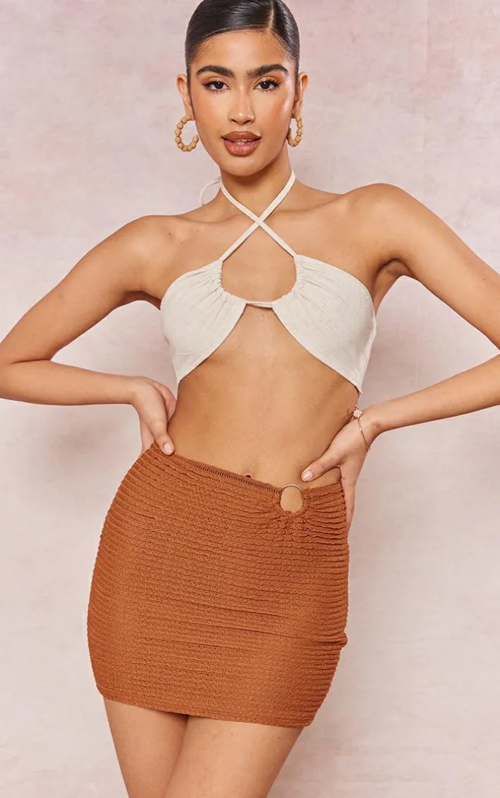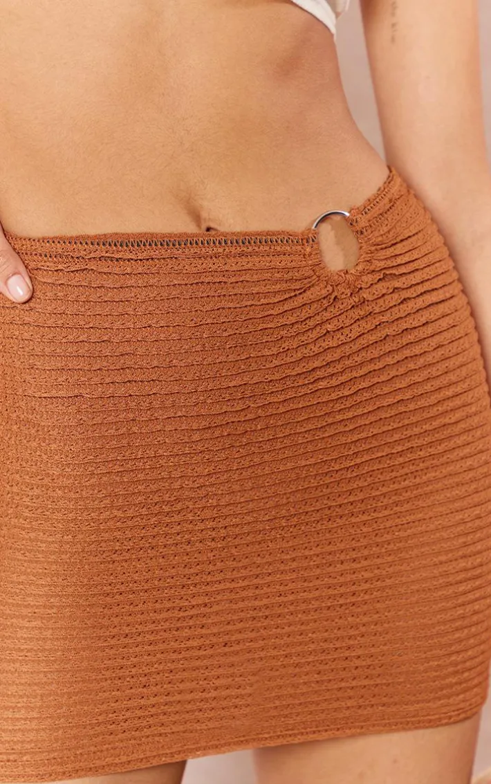 Take your weekend wardrobe to new heights with this chocolate textured jersey ring detail mini skirt, you’re sure to have heads turning for all the right reasons. With a chocolate hue textured material, a ring detail and a mini length, how could you say no? Pair with a bralet, slip-on heels and your fave accessories for a look that is perfect for your next date night and beyond.
