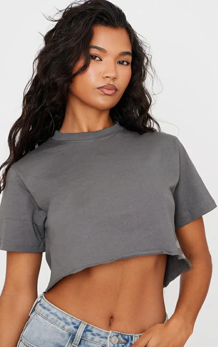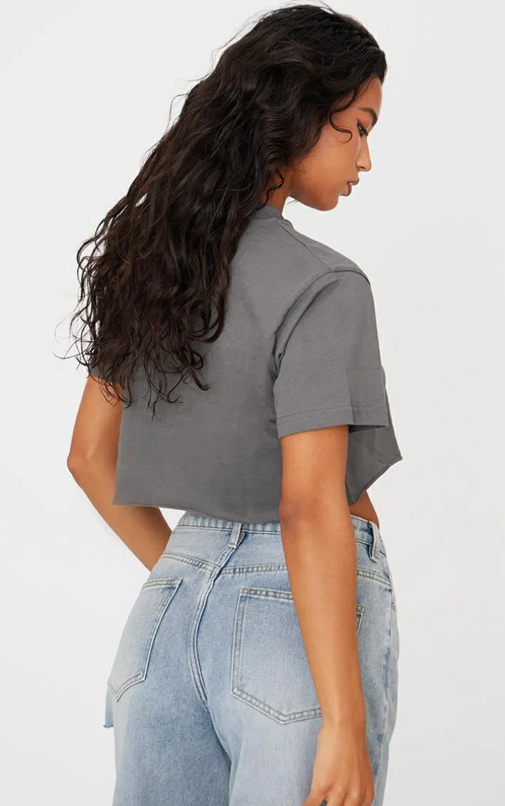 Give your basics collection a refresh with this tee, Featuring a charcoal organic material with short sleeves and a cropped length, we’re obsessed. Style with neutral bottoms and kicks for a fresh off-duty look.