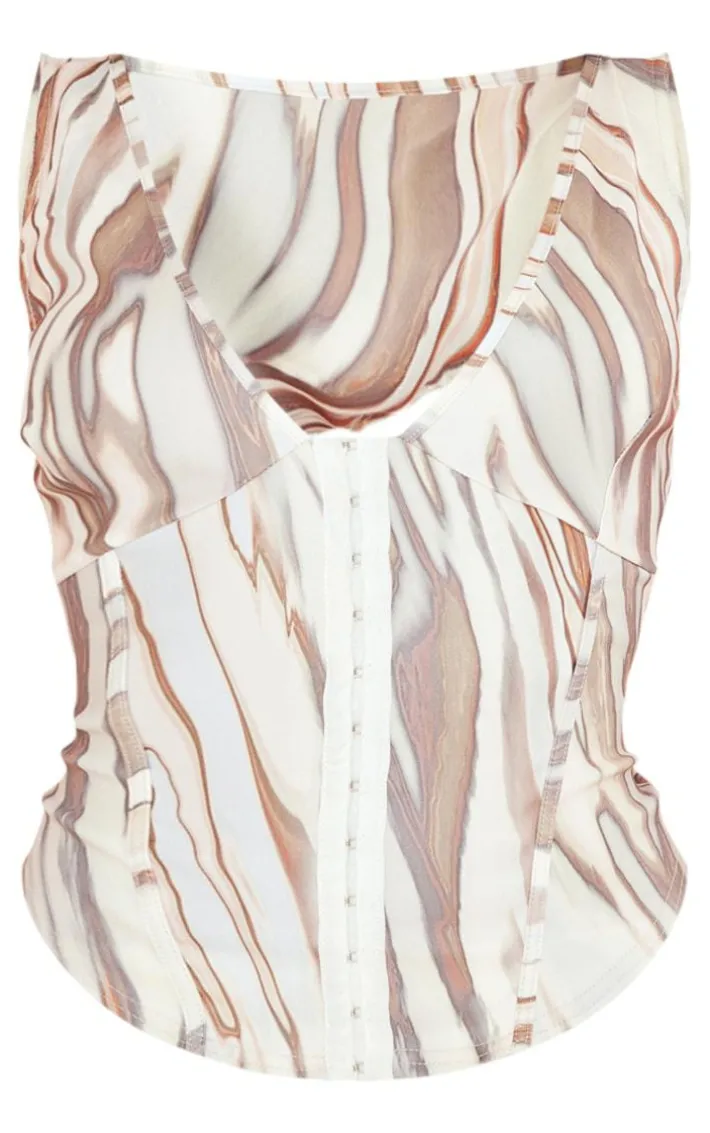 Take your look to the next level with this cream animal print stretch woven plunge hook and eye corset top. This corset top is brought to you in a cream animal woven print material with a plunge neckline and a hook and eye style, what more could you ask for? If it’s a date nightthen this corset top is calling your name. Pair effortlessly with a mini skirt and clear high heels for a look that will have all eyes on you.