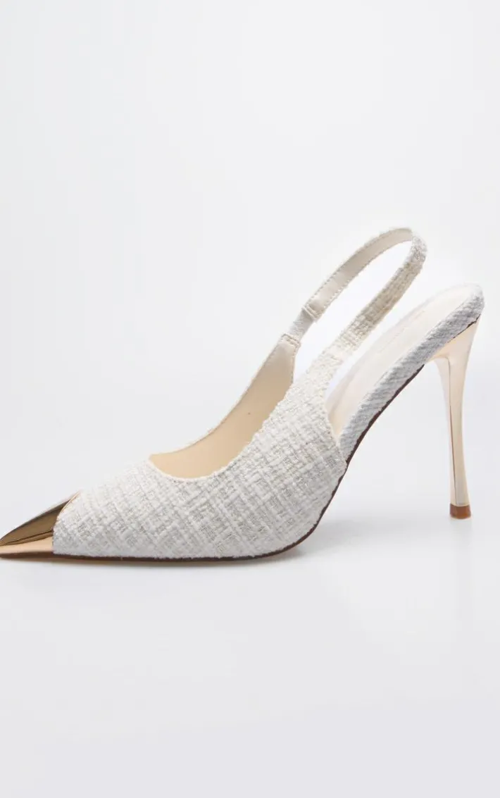 Get ready to add some luxe vibes to your ‘fit with these cream boucle metal toe cap high stiletto court heels. Their cream shade is unreal, with a boucle material, a metal toe cap detail and court style, how can you resist? Style with a shift dress and shoulder bag to complete the look.