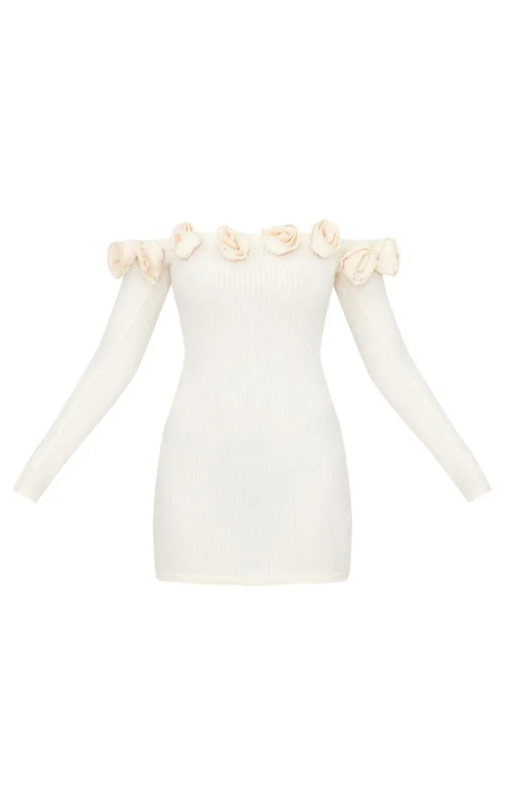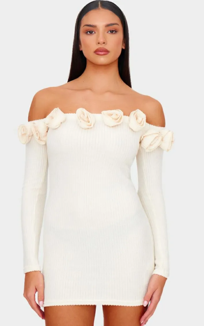 Add a touch of luxe to your look with this cream brushed rib corsage detail bardot bodycon dress. Brought to you in a cream brushed rib material with a corsage detail and a bardot design, what more could you want? this bodycon dress pairs perfectly with some knee high chunky boots and and gold accessories to turn heads for all the right reasons.