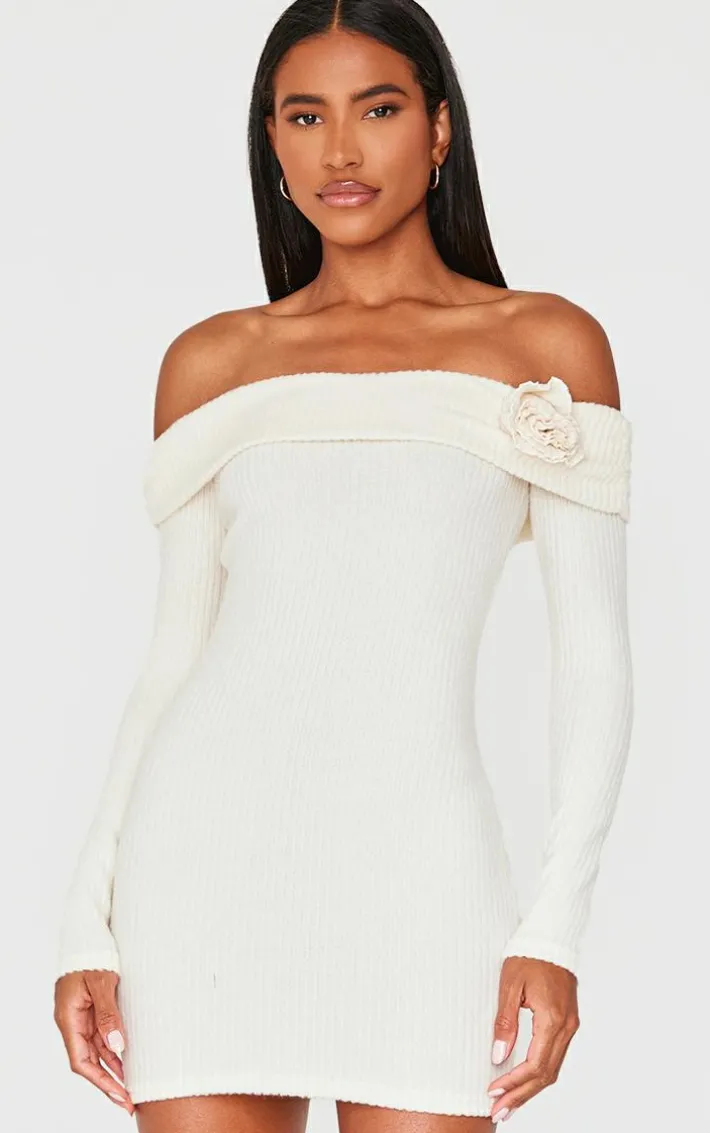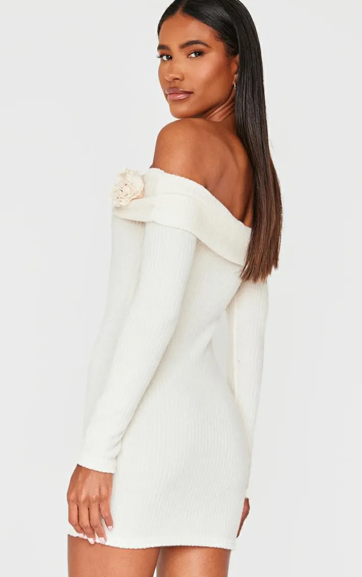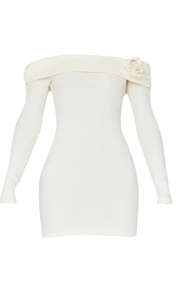 Own the night in this cream brushed rib fold over bardot corsage detail bodycon dress. Brought to you in a cream brushed rib material with a fold over bardot design and a corsage detail, this bodycon dress is the ultimate must have. Team with your fave accessories and a pair of knee high boots to complete the look.