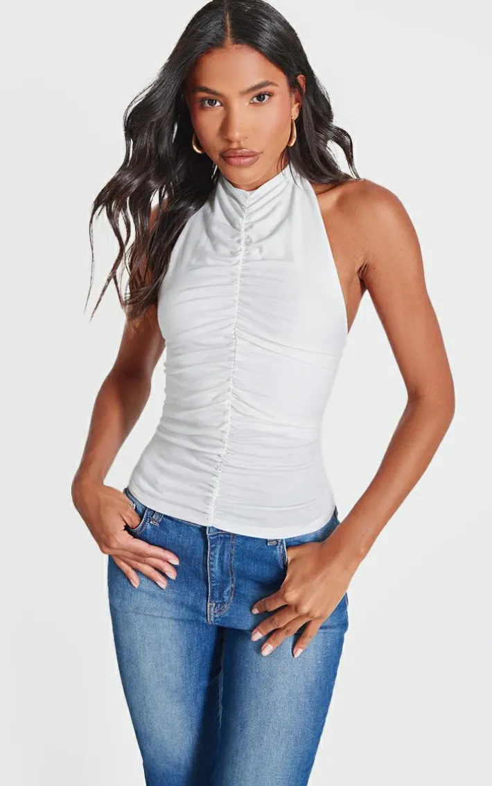 Keep your style game strong with this cream contour jersey ruched halterneck long top. Brought to you in a cream contour jersey material with a ruched design, you wont blend in doll. Its halterneck fit is perfect for those day to night looks and beyond. Pair it with your staple denim jeans for a combo that can be dressed up or down.