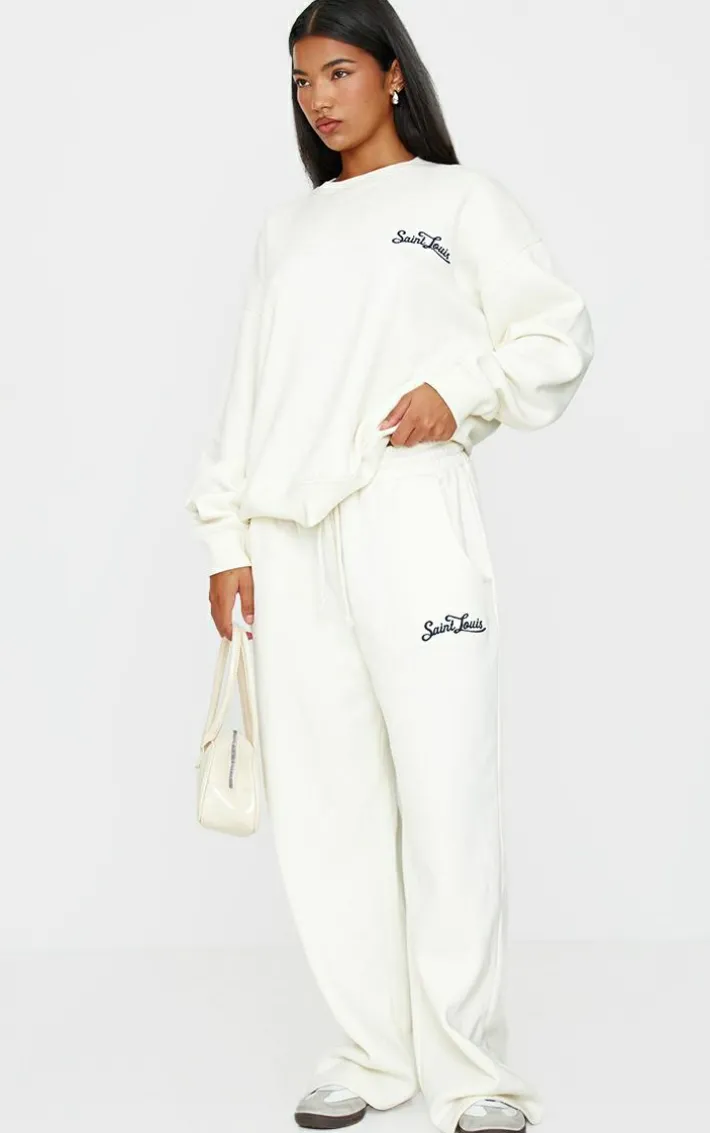 Take your casual wardrobe to new heights with these cream contrast embroidered saint louis low rise wide leg sweatpants. Brought to you in a cream hue sweat material with a contrast design, an embroidered ‘Saint Louis’ Graphic detail, and low rise fit these wide leg sweatpants are everything you need and more. Pair with the matching Sweatshirt, fresh kicks and simple accessories for an off duty look that won’t go unnoticed.