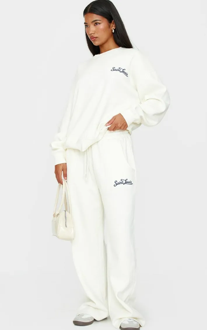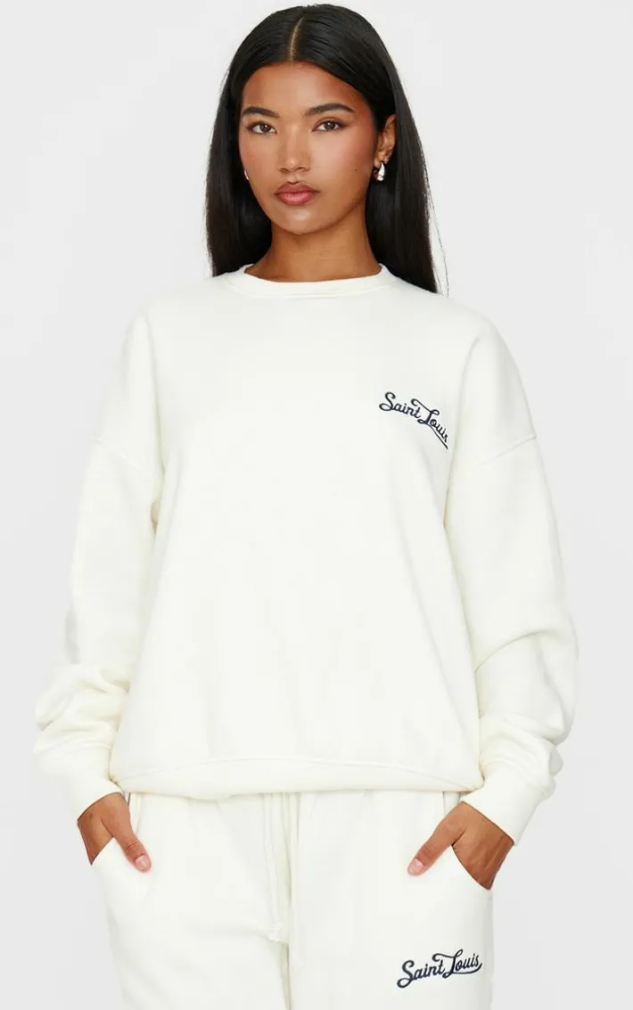 Look all kinds of cosy in this cream contrast embroidered saint louis oversized Sweatshirt. Brought to you in a cream hue material with a contrast design and embroidered ‘Saint Louis’ detail, this oversized Sweatshirt is a must have. We’re in love. Style with the matching sweatpants and your fave accessories for a dreamy off duty look everyone will be asking about.