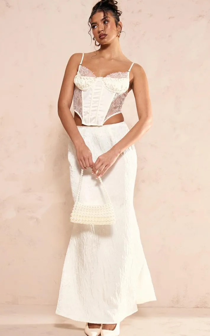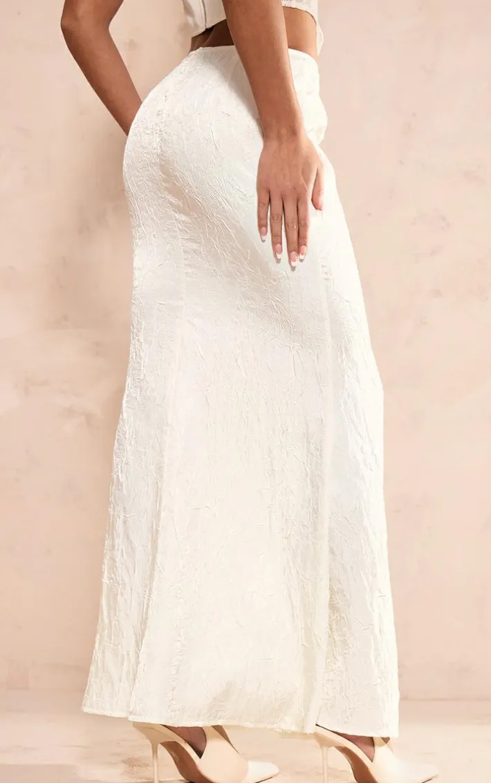 Get ready for your next special occasion with this cream crinkle satin fishtail low rise maxi skirt, you’re sure to be at the center of attention. This skirt features a cream crinkle satin material with a fishtail design and a low rise style. Just add a corset top, court heels and a pearl bag for a look no one will forget.