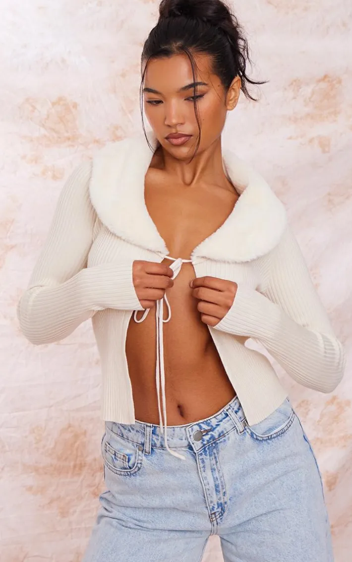Level up your knitwear collection with this cream faux fur collar rib knit cardigan. This cardigan is brought to you in a cream rib knit material with a faux fur collar and long sleeves, what’s not to love? This cardigan is here to banish any of your what-to-wear dilemmas doll. Style this with pants, chunky boots and accessories for the ultimate combo.