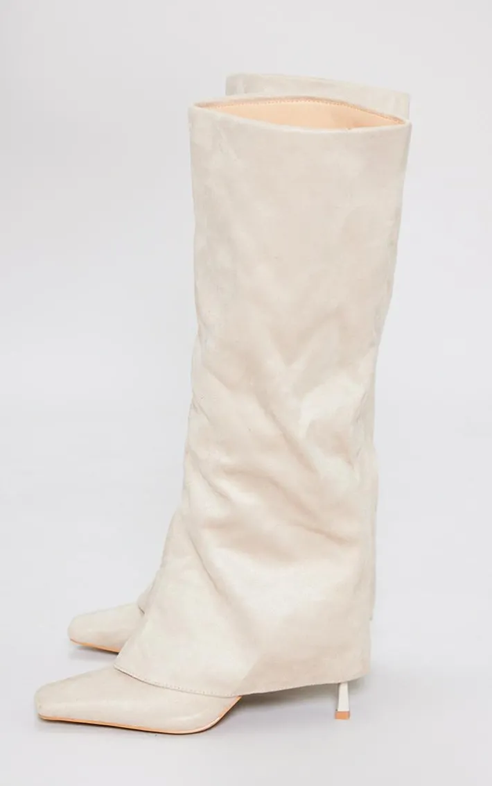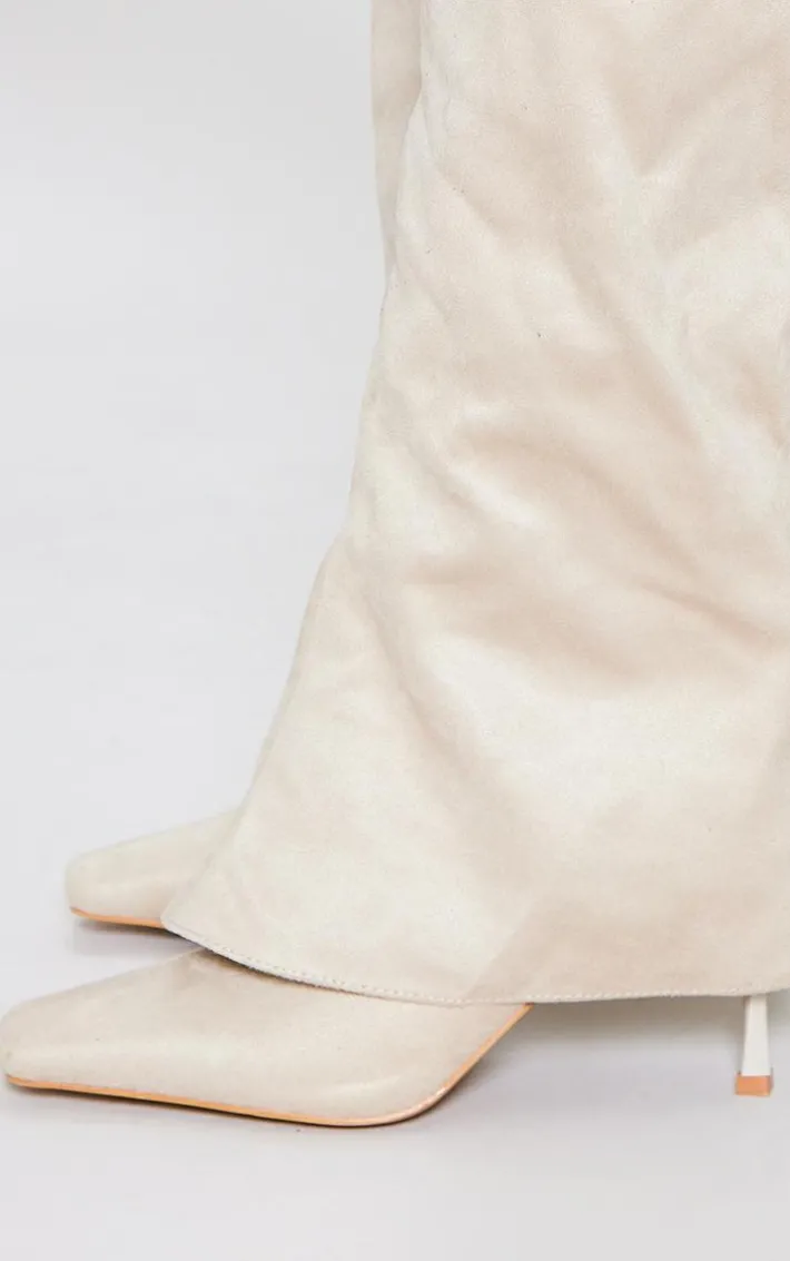 Step into the new season in style with these cream faux suede square pointed toe fold over low heeled knee boots, get ready to bring all the drama. These boots feature a cream faux suede material with a fold over design and a low heel, what’s not to love? Pair these faux suede boots with your fave outfit of the day for a look everyone will want.