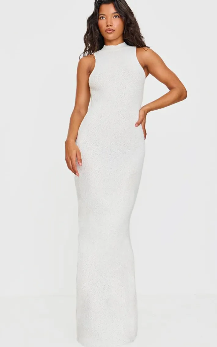 Make a statement with this cream fluffy boucle knit racer maxi dress. Brought to you in a cream knit material with a fluffy boucle design and a racer neck detail, what more could you want? This maxi dress is all you need to stand out from the rest. Team with your highest heels and your go-to accessories for an Insta worthy finish everyone will obsessing over.