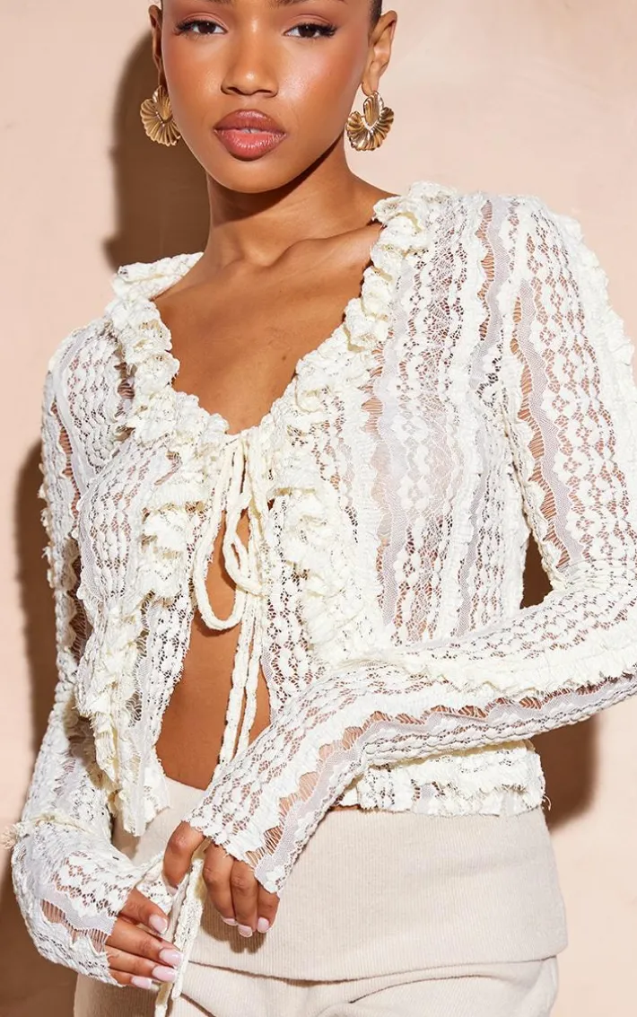 Give your wardrobe a seriously chic update with this cream lace ruffle detail tie blouse. Brought to you in a cream material with a lace ruffle detail and tie front, what’s not to love? Style with cream shorts, sandals and gold accessories for a look we’re obsessed with.