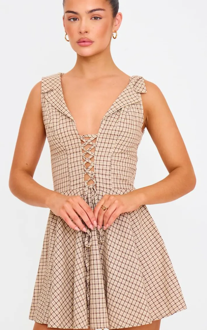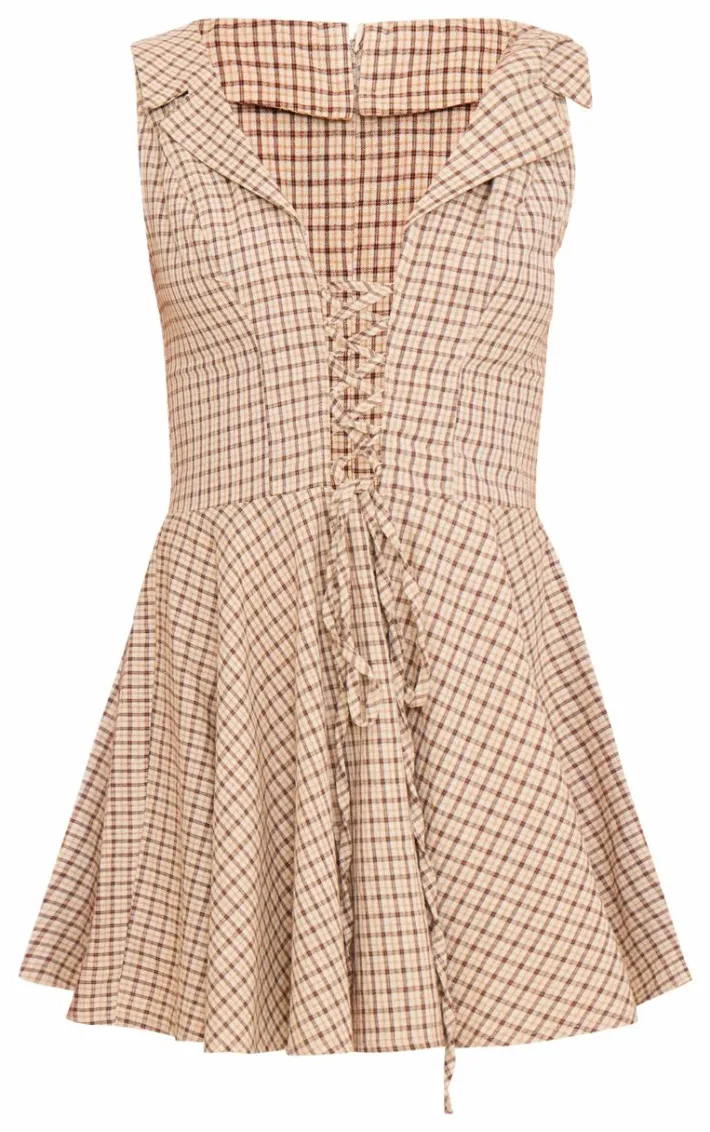 See in the new season with this cream lace up check shift dress. It’s a versatile piece that can be kept casual during the week or elevated for an evening look, with its cream check fabric, lace up front feature and collared neckline. Keep it cosy with a pair of faux suede flats, frilly socks and gold hoops.